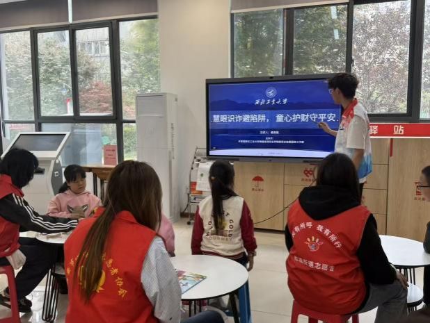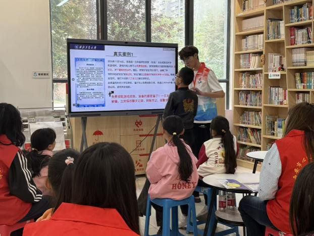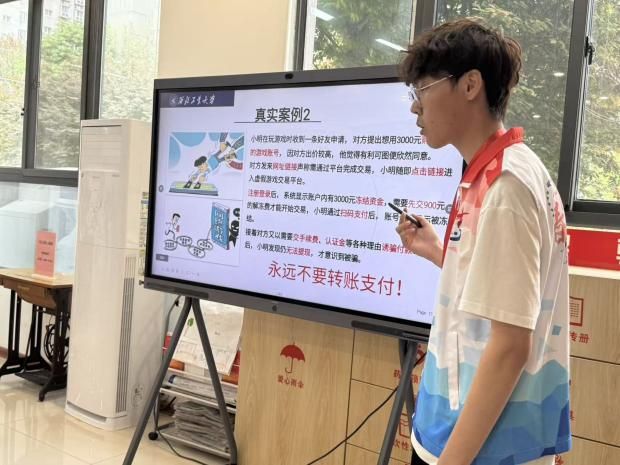 活动中,学院2024级本科生谢忠航以生动易懂的方式,为社区小学生带来反诈安全课堂。他结合小学生日常网络场景,拆解了游戏免费皮肤、校园扫码领礼品、追星门票、快递理赔等常见诈骗陷阱,揭示“免费”“优惠”背后的诈骗套路,提醒孩子们警惕个人信息泄露和转账风险。