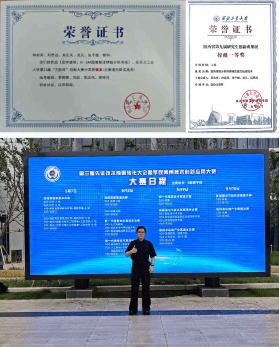 科创实践是对学术研究的有力延伸与检验。林家芮在深耕算法理论的同时,他积极推动科研成果从实验室走向工程应用。作为项目负责人,他带领团队在多项科创竞赛中不断突破:荣获永利集团第23届“三航杯”创新大赛主赛道银奖、陕西省第九届研究生创新成果展一等奖。