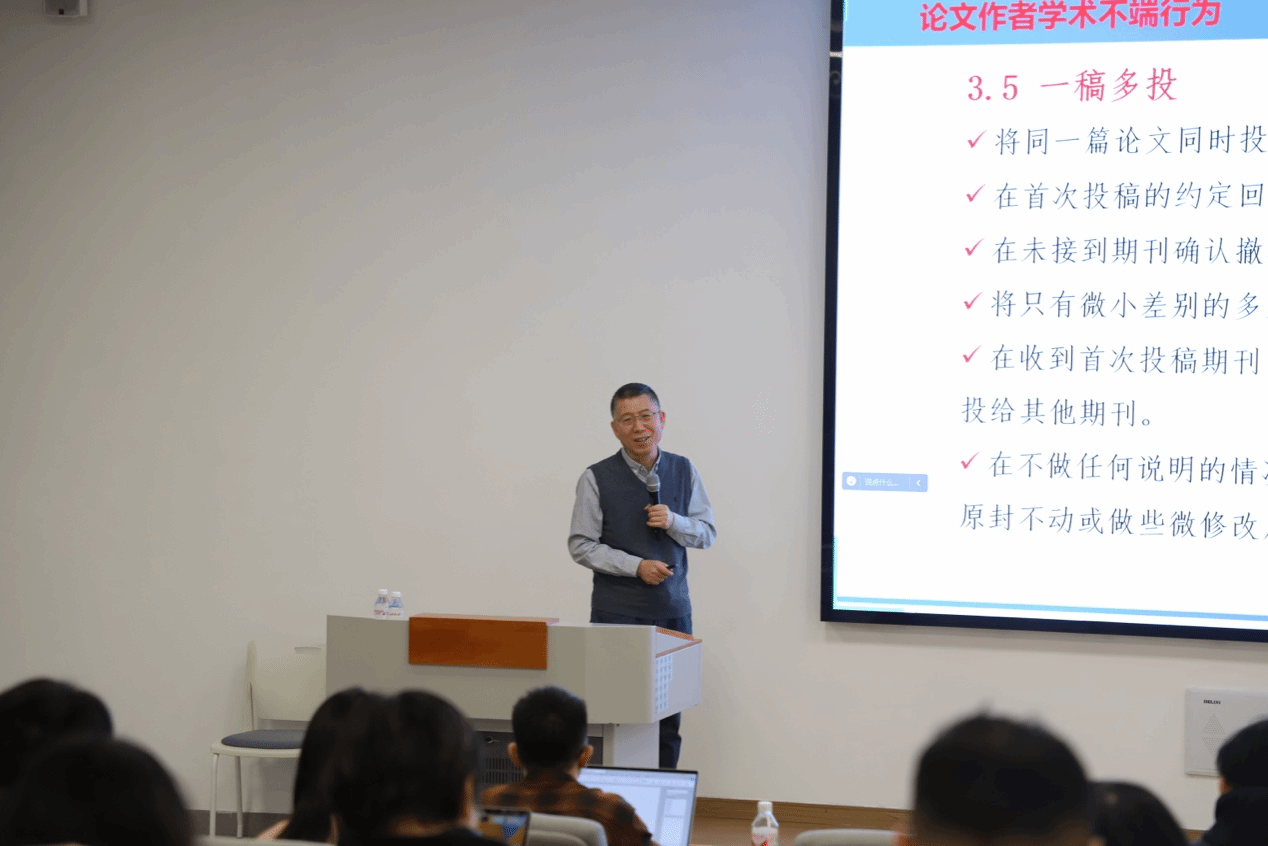 讲座中,倪老师详细解读了国家最新科研成果评价政策并结合具体案例分析了学术不端行为的危害和后果。他嘱咐在场师生要深刻理解习近平总书记勉励科研工作者“把论文写在祖国的大地上”的实践意义,要下苦功夫、做真学问。倪老师强调,科研诚信不仅是个人学术发展的基石,也是我国科技事业健康发展的重要保障,从事科学研究的过程中,应严格遵守国家相关法律法规和学术道德规范,坚持科学真理、尊重科学规律、崇尚严谨求实的学风,维护科学诚信。