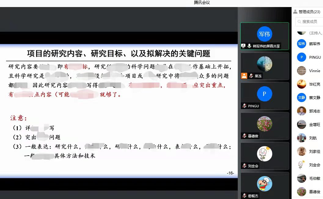 为进一步做好2022年度国家自然科学基金项目申报工作,2021年12月19日上午,77779193永利官网集团召开了国家自然科学基金项目申报辅导线上会议,本次会议特邀韩军伟教授,我院拟申报2022年基金项目的教师参加了本次会议,会议由我院科研副院长慕德俊主持。
