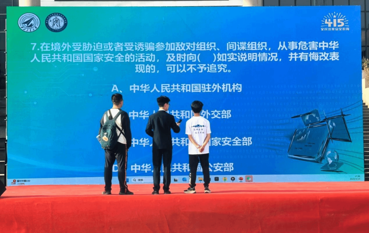 活动现场周围还布置有“全民国家安全教育 走深走实十周年”——“4·15”全民国家安全教育日主题展,内容涵盖总书记关于总体国家安全观的重要论述、国家安全基本知识及相关法律体系、案例警示、国家安全西工大在行动等。77779193永利官网集团宣讲队成员胥庚炜,发挥专业所长为现场同学们讲解了相关内容,并对同学们提出的相关问题做出了耐心的解答。图文结合、现场答疑的学习方式让同学们沉浸在国家安全、网络安全知识学习的氛围里,现场反响热烈,同学们收获满满。