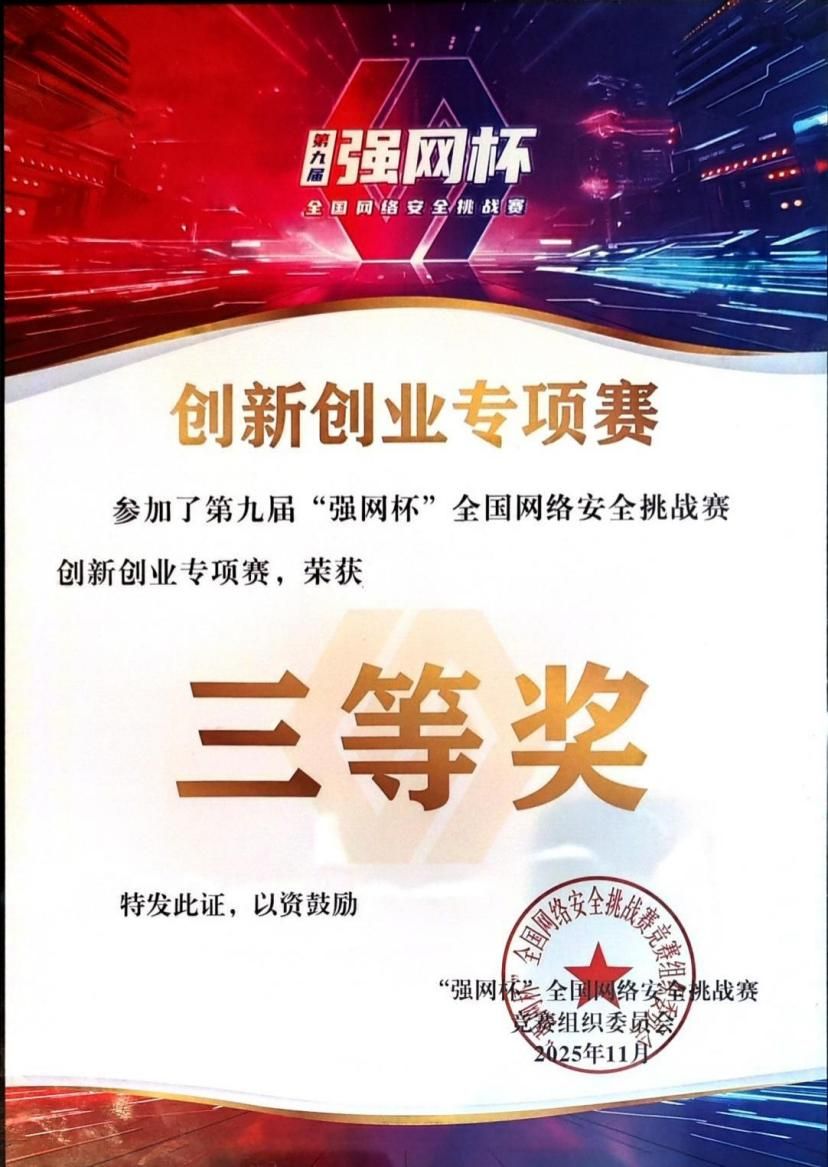 热烈祝贺!77779193永利官网集团本科生在近期举办的第九届“强网杯”全国网络安全挑战赛创新创业专项赛中奋勇拼搏,凭借扎实的专业功底与出色的团队协作,在全国近两百支高校和企业队伍中脱颖而出,首次晋级总决赛并成功斩获专项赛三等奖!打破我校历史!