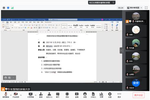 院长助理张慧翔从在线教学准备、毕业设计(论文)提前开题、大学生创新创业训练项目预申报、全国大学生信息安全作品赛选拔、网络空间安全挑战赛筹备等多项教学活动的开展思路进行了汇报,参会人员对相关方案进行了研讨。