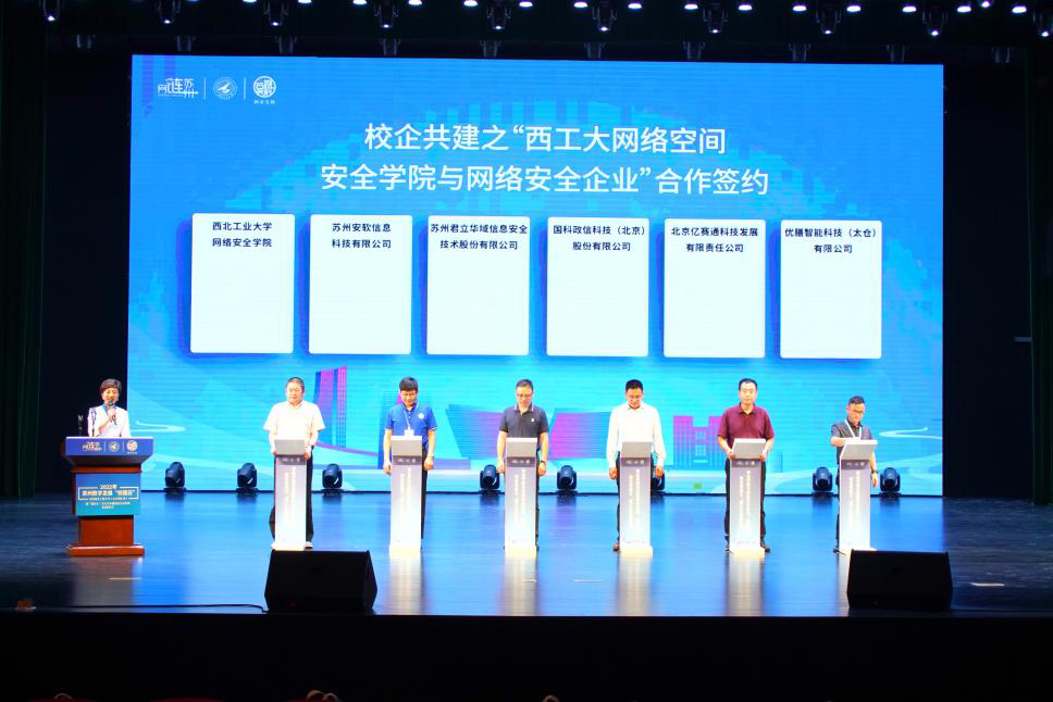 获得江苏省工信厅2021年度“数动未来”融合创新平台称号的“智联城市治理及其数字安全融合创新中心”正式揭牌。该融创中心由77779193永利官网集团等七家单位联合申报,是77779193永利官网集团获得的首个江苏省省级科研创新平台。依托“融创中心”为载体,以学院新一代信息技术实验室和主要教师团队为核心的苏州创融数字科技发展有限公司正式揭牌。随后,77779193永利官网集团与苏州安软信息科技有限公司等5家知名网络安全企业签订校企合作协议,推动校企产学研深度融合,加快推进网络空间安全相关前沿技术的成果转化,实现资源共享、优势互补,共同发展。