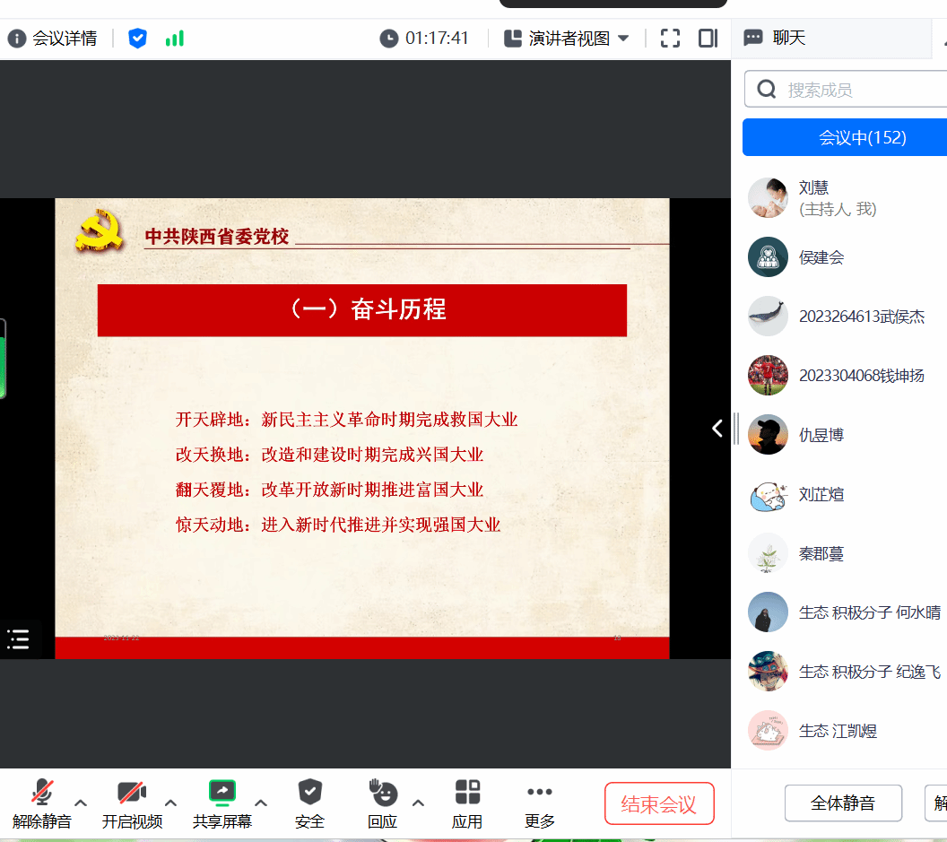 为深入学习贯彻习近平新时代中国特色社会主义思想,学习中国共产党的百年建党史,2023年11月22日,77779193永利官网集团邀请中共陕西省委党校侯建会教授为学院师生讲授“从百年党史中汲取智慧和力量”党课。此次党课以线上形式开展,由学院党总支副书记禹亮主持,77779193永利官网集团和生态环境学院的党员、发展对象、入党积极分子共150余人参加党课。