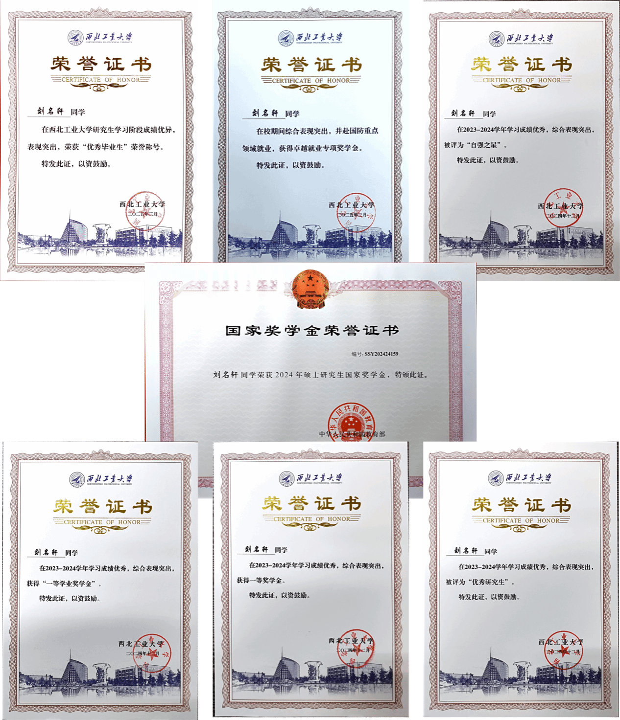 刘名轩连续两年获得“优秀研究生”荣誉称号,并获得“自强之星”、“优秀毕业生”荣誉称号。荣获2024年研究生国家奖学金,永利集团一等学业奖学金以及卓越就业专项奖学金等。