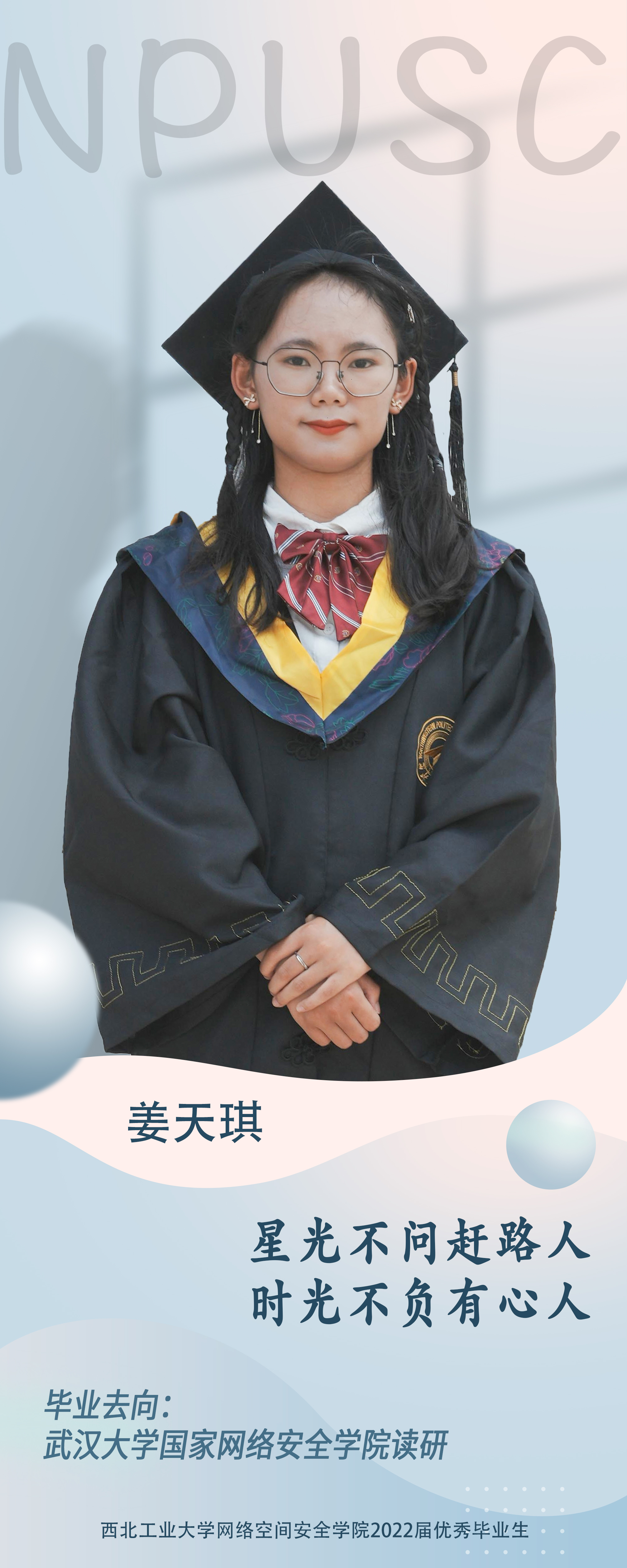 学院2018级本科生姜天琪。学习上,她态度端正勤奋好学,目标明确学习热情高。在努力做到学好专业知识的同时,还涉猎其他方面的知识,最终也取得了优异的成绩,连续三年获得院优秀奖学金。学习之余,她还爱看各种文学类书籍,想要由此提高自己的思想境界。生活上,她一直保持着“走一步,停下来,思考一番,再继续走,稳扎稳打”的生活态度。乐观向上,踏实务实是大多数人对她的评价。本科期间曾担任学生会副部长。曾获得院优秀学生、永利集团优秀共青团员、陕西省数学竞赛二等奖、永利集团信息安全竞赛作品赛一等奖等。曾在心++志愿者协会进行了为期一年的支教活动;参与学生大使、网安宣传周等多项志愿活动。