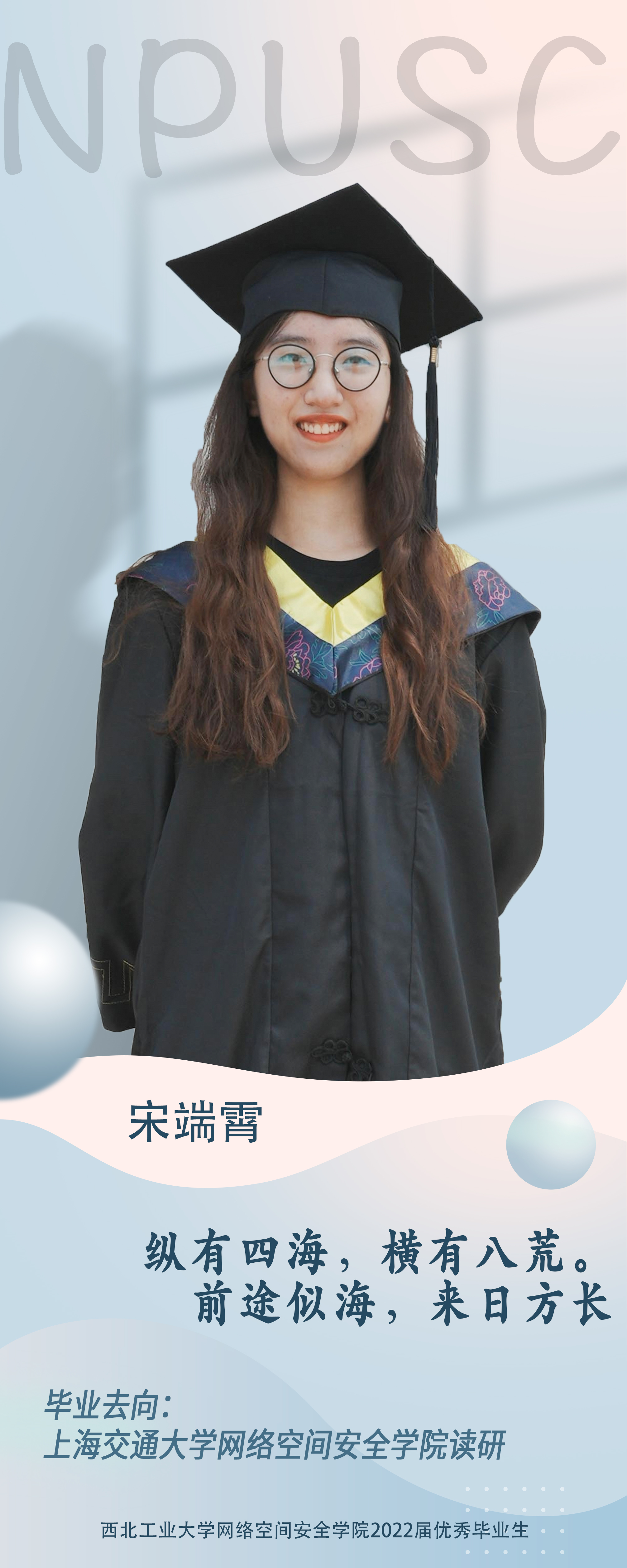学院2018级本科生宋端霄,曾担任学院学生会副主席、2018级1班学习委员;曾获校级优秀学生、全国大学生数学建模竞赛省级二等奖等;参与并主持多项大学生创新创业项目,并将成果转化为多项专利。她重视实践活动,参加了校运会、“七一合唱”等多类文体活动,并以学生大使的身份返回母校积极宣传。