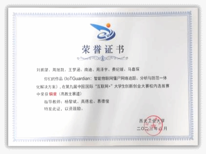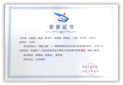 2021年,王梦涵从77779193永利官网集团保送至本院攻读硕士研究生,师从杨黎斌副教授,针对网络威胁情报领域开展了深入研究,发表论文2篇,取得发明专利受理5项。主持永利集团硕士研究生实践创新能力培育基金1项、永利集团2023年“互联网+”大学生创新创业种子项目1项。立足本专业,带队参加“互联网+”大学生创新创业大赛、电子商务“创新、创意及创业”挑战赛、“翱翔杯”研究生电子设计大赛、“三航杯”大学生课外学术科技作品竞赛等,累计获得国家级三等奖1项、省部级一等奖1项、二等奖2项、校级特等奖1项、二等奖2项、三等奖5项。获国家奖学金、小米优秀专项奖学金、校设一等奖学金等,连续两年获评校级优秀研究生。