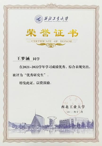 在学习科研之余,她还参加了“百名党员讲党史”、“党员读原著”活动,从百年党史中汲取奋进力量;参加庆祝中国共产党成立100周年合唱展演,献礼建党百年;参加照金纪念馆学习实践,重温峥嵘史诗、重走革命路线;参加保密教育培训,筑牢保密思维,增强保密意识;参加全民国家安全宣传教育等活动,学习发言多次被学院、学校公众号文章推送,充分发挥了党员同志的先锋模范作用,连续两年获评院优秀共产党员。