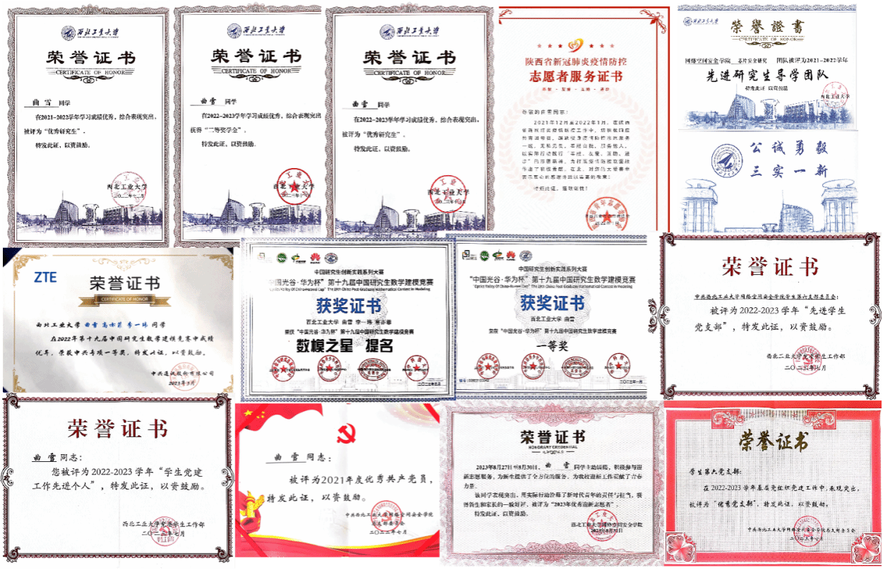 她正视困难、求实奋进,成绩始终位于专业前10%,连续两年获评永利集团“优秀研究生”,获校级奖学金。面向国家安全重大战略需求,在导师和团队老师引领、同门配合下,曲雪积极参与科学研究,参加国家重点课题2项,发表论文2篇,专利1项,软著1项。同时,参与教材编写,担任本科生专业课程助教,并踊跃参加实习实践交流活动,不断更新知识、拓宽视野,提升自身能力。此外,曲雪多次参加学科竞赛并均取得优异成绩。在第十九届“华为杯”研究生数学建模竞赛中从近1万8千支队伍中脱颖而出,获国家一等奖(获奖比例为1.10%),中兴专项一等奖(仅两队),数模之星提名奖(获奖比例为0.067%)。