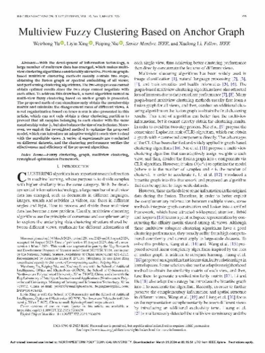 [1] Yu W, Xing L, Nie F, and Li X, Multi-View Fuzzy Clustering Based on Anchor Graph[J].