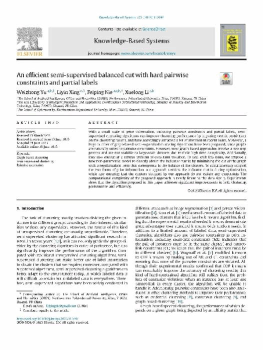 [2] Yu W, Xing L, Nie F, and Li X, An Efficient Semi-supervised Balanced Cut with Hard Pairwise Constraints and Partial Labels[J]. Knowledge-Based Systems, 2023, 276: 110747.(SCI一区,与老师共同一作)
