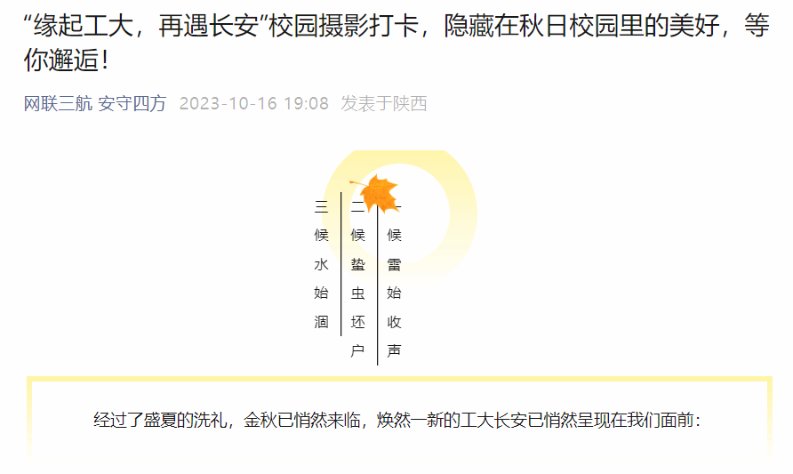 在夏秋之交,槐序已去,金秋送爽的美好时节,77779193永利官网集团研究生会联合计算机学院研究生会、自动化学院研究生会以及永利集团学生摄影学会共同举办了名为“缘起工大,再遇长安”的校园摄影打卡活动。此次活动以校园摄影为媒介,为同学们提供一个展现自我、感受校园文化的机会,既帮助了新同学们快速熟悉校园环境,又带领同学感受到工大校园浓厚的人文气息。