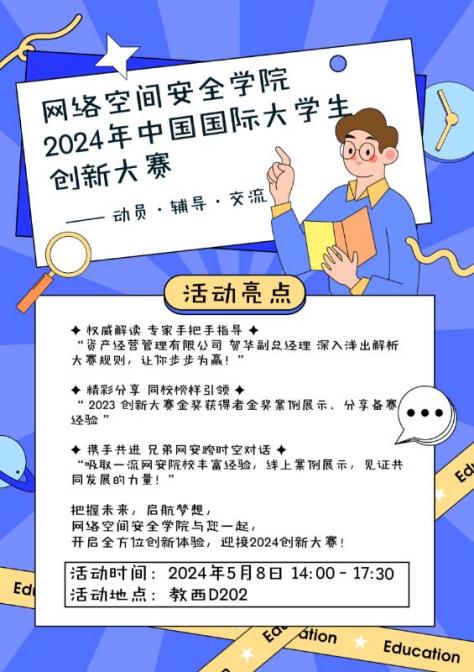(三)服务同学,大力推进创新创业。学院团委积极响应校团委和院党委的号召,组织动员广大网安学子参加各类创新创业大赛,召开专题动员辅导会,邀请国赛专家、校双创工作资深导师、全国不同赛道金奖项目负责人进行多轮次指导和经验分享,同兄弟网安学院跨时空对话,吸取一流网安院校丰富经验,在学生中形成了良好的学科竞赛氛围,成效显著。学院应邀在2024世界互联网大会“互联网之光”博览会参展,展示学院特色学科方向和人才培养体系。近年来,学院学生在中国国际大学生创新创业大赛中共获得省级及以上奖项10余项,今年学院团队在国赛中获得铜奖,在挑战杯“揭榜挂帅”专项赛中获得国家级一等奖、二等奖各1项,实现学院在此类竞赛上的新突破。