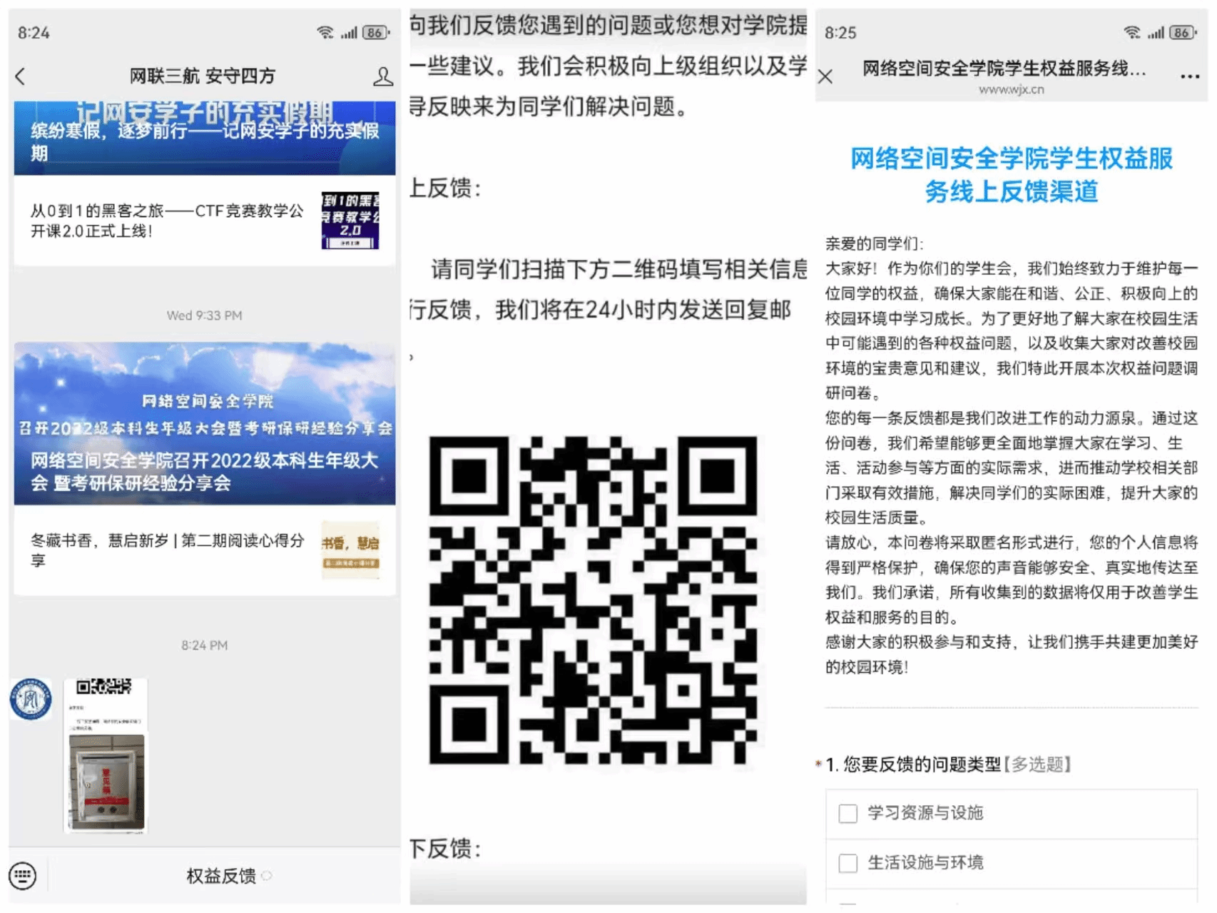 通过学院官方微信公众号“网联三航 安守四方”,点击界面下方“权益反馈”功能键,即可在线填写电子问卷提交建议。系统支持实名与匿名双模式,每周定时收集整理反馈信息。