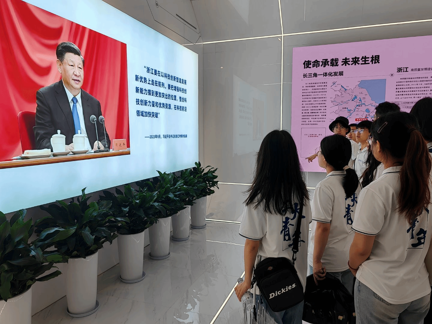 图为实践队队员参观展馆内产品