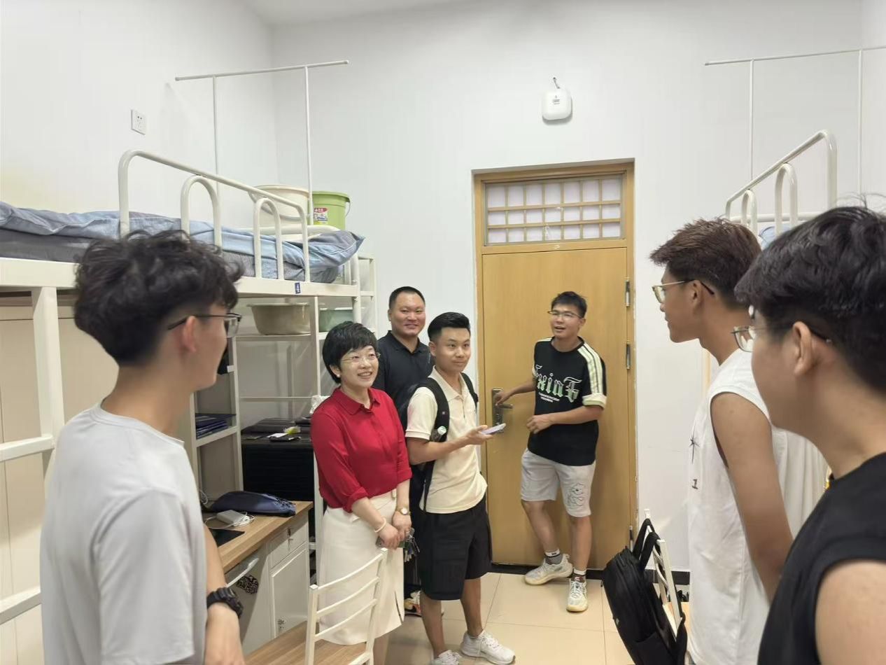 学院领导高度重视新生入学适应情况。迎新期间,张文涛、杜瑶分别带领辅导员、班主任等走访慰问了新生宿舍,与同学们亲切交流,细致询问大家入校后的生活适应情况,耐心解答同学们关于学业、生活等方面的疑问,并鼓励新生尽快转变角色,融入大学集体生活,珍惜舍友缘分,共同营造积极向上的宿舍氛围。
