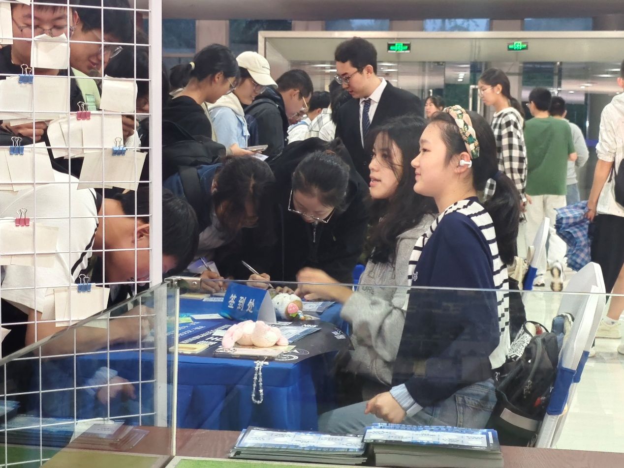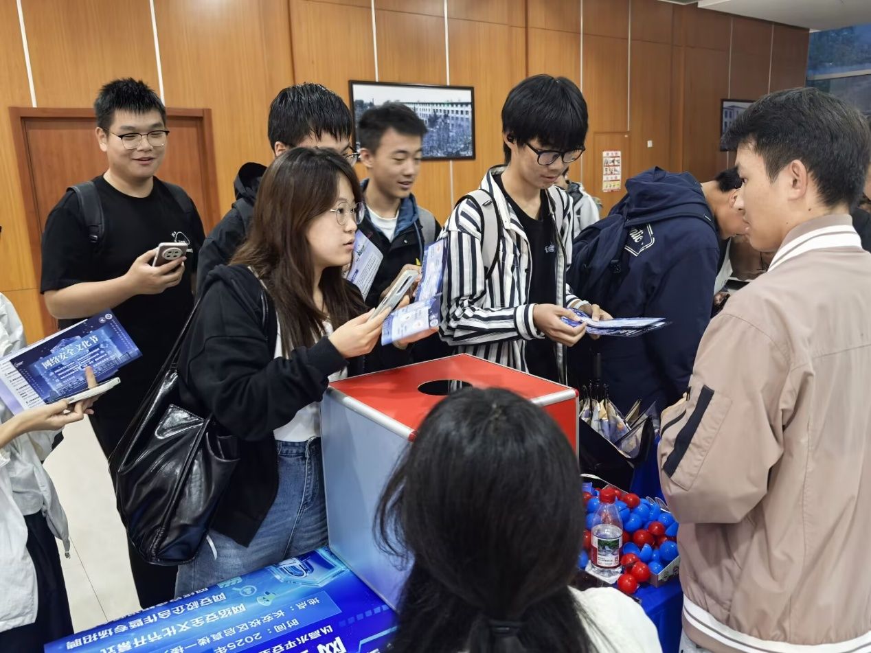 主舞台后侧,还设有文化节活动站点,“签到寄语”、“‘探索解密’趣味密码比赛”、“网络安全知识竞答比赛”、“网络安全微小说大赛”、“网络安全短视频大赛”及“集印有礼”六个展位,从艺术创作,知识储备再到专业技能的多样形式,寓教于乐,这些丰富有趣的子活动,吸引了大批同学参与报名,并通过集章打卡抽取精美礼品,现场气氛轻松活跃,欢声笑语不断。