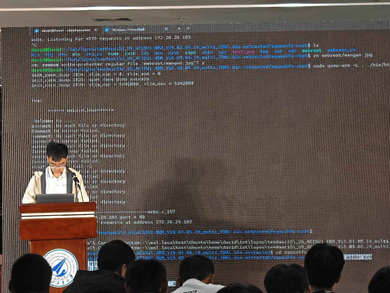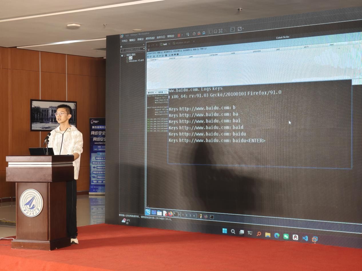 互动表演环节,由马君儒同学与王少君同学主持,紧张刺激的技术展示与互动解密依次上演。首先,永利集团学生信息安全协会副会长、网络空间安全大学生创新实践基地成员薛沛元为同学们演示了钓鱼网站技术,大屏幕上,以假乱真的钓鱼网站和欺骗性极强的钓鱼邮件呈现在同学们眼前;接着,协会会长、基地成员周子博进行了路由器攻防演练,终端上跳动的字母汇聚成路由器界面上被替换的图片,技术的魅力与网络安全的重要意义被生动诠释。