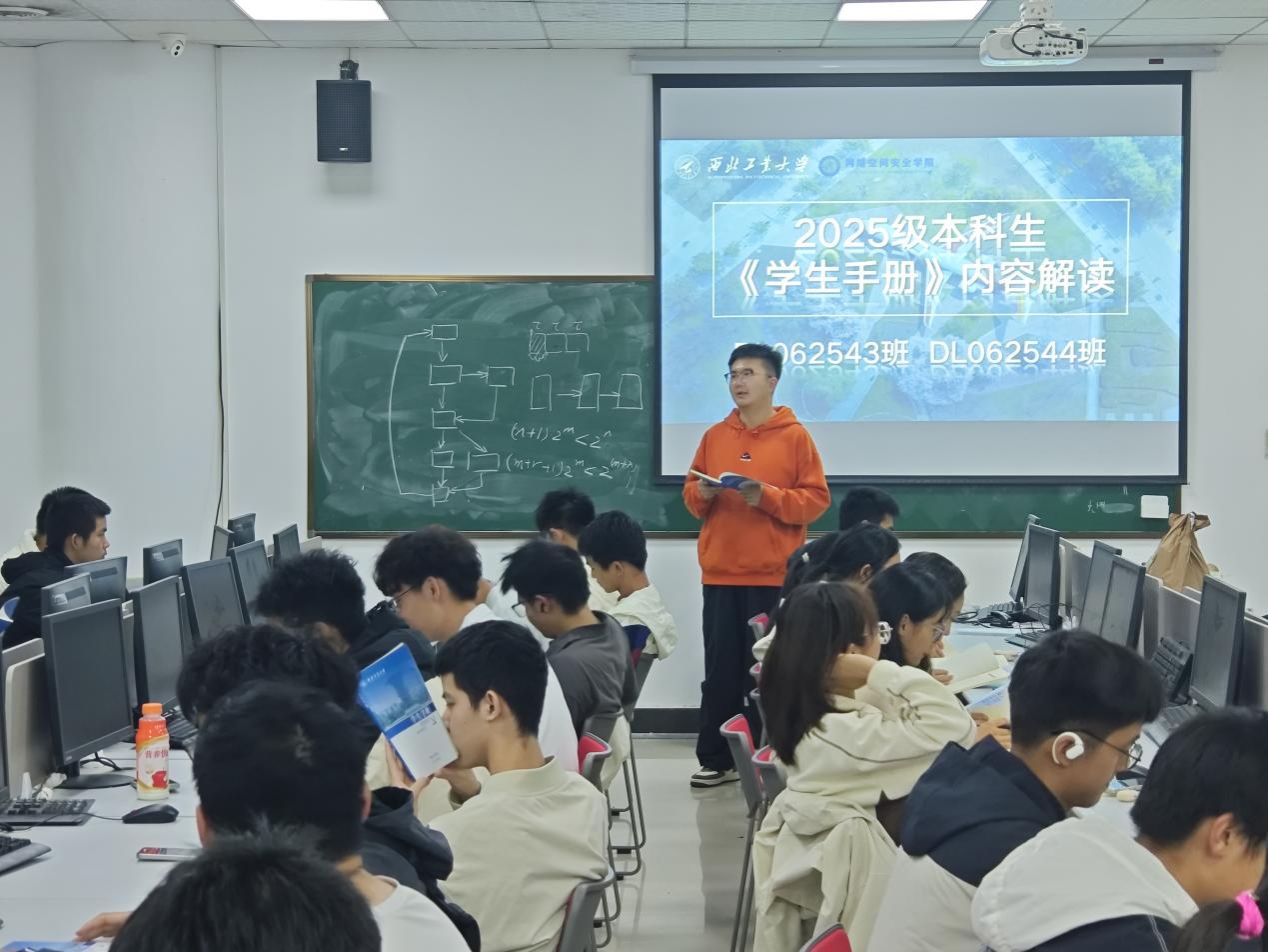 付强围绕《学生手册》的核心内容,从行为准则、学习纪律、毕业条件、违纪处分、奖励资助、公寓管理、体质测试等方面为各班进行了系统、深入的解读。结合往年的典型案例,对重点条款进行了细致的剖析,使同学们对各项规章制度有了更直观、更深刻的理解。讲解过程中,他特别强调了要“主动预防、及时报告、有效沟通”,提醒同学们要时刻绷紧纪律之弦,明确行为边界,规避潜在风险,筑牢个人与集体安全防线。