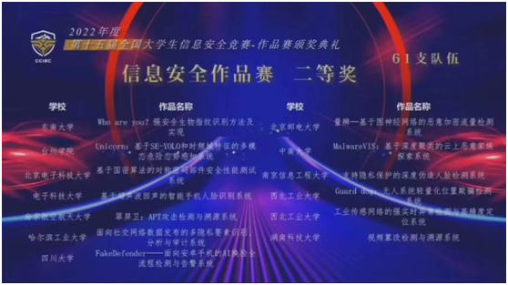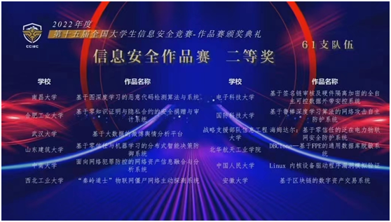 2022年8月20日-24日,第十五届全国大学生信息安全竞赛决赛落下帷幕,全国大学生信息安全竞赛是由教育部高等学校网络空间安全专业教学指导委员会发起并主办、中央网信办支持、教育部认可的56项“全国大学生学科竞赛”之一,分为作品赛和创新实践能力赛两种竞赛方式。我校获得作品赛全国二等奖3项,创新实践能力赛全国二等奖1项,三等奖1项。