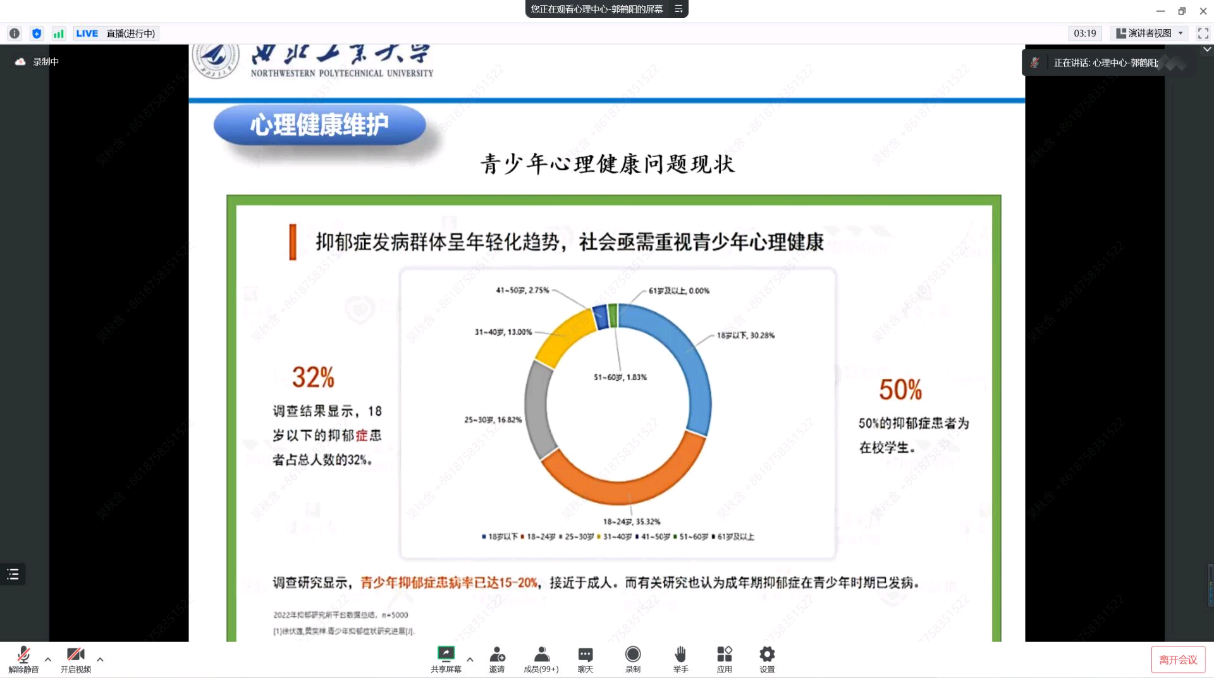 本次讲座由学生心理健康教育中心郭鹤阳老师担任主讲人。郭鹤阳老师从新生学习生活中的学习阶段和学习挑战入手,介绍了诸多青少年心理健康问题的现状,强调了心理健康的重要性,同时详细深入阐述了正确的心理调节方法。