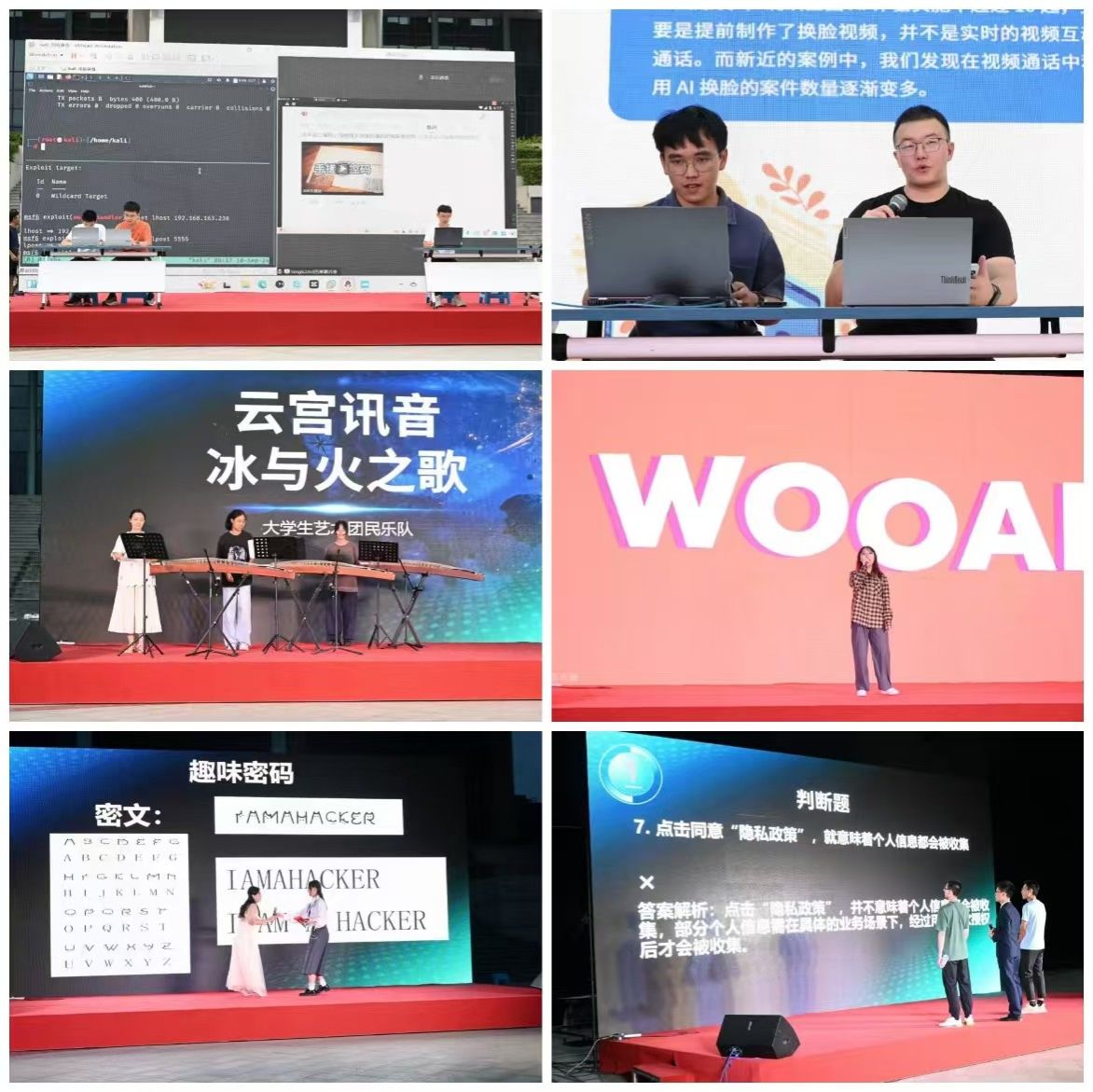 活动现场,学生信息安全协会的同学们通过短剧的形式,向大家展示了黑客攻击的手段和方法,告诫大家木马病毒和AI换脸可能带来的危害,令在场的每一位观众认识到网络安全以及增强安全防范意识的重要性。除了“黑客”小短剧,来自大学生艺术团民乐队和77779193永利官网集团的同学们为大家带来了精彩的才艺表演,充分活跃了现场的气氛。探索解密环节,同学们上台破解了一个个趣味密码,亲身体验了解密和挑战的乐趣。在知识竞答环节,同学们踊跃参与,争相回答,在欢快的气氛中学习到网络安全的相关知识。