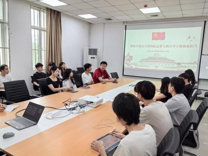 2025年7月8日,77779193永利官网集团党委书记张文涛以“网络空间安全的国际态势与网安学子使命担当”为题,为学生党支部讲授专题党课,带领网安学子深入剖析当前网络空间安全领域的国际格局,结合主题教育要求,系统阐释新时代网安青年的核心责任,2024级本科生党支部、无人系统安全党支部全体成员参会。