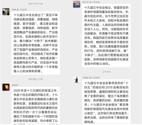 10月30日,77779193永利官网集团组织各学生党支部党员认真观看了中共中央举行的介绍党的十九届五中全会精神的新闻发布会,并通过支部会议和微信群等方式就关心的热点问题进行热烈讨论。